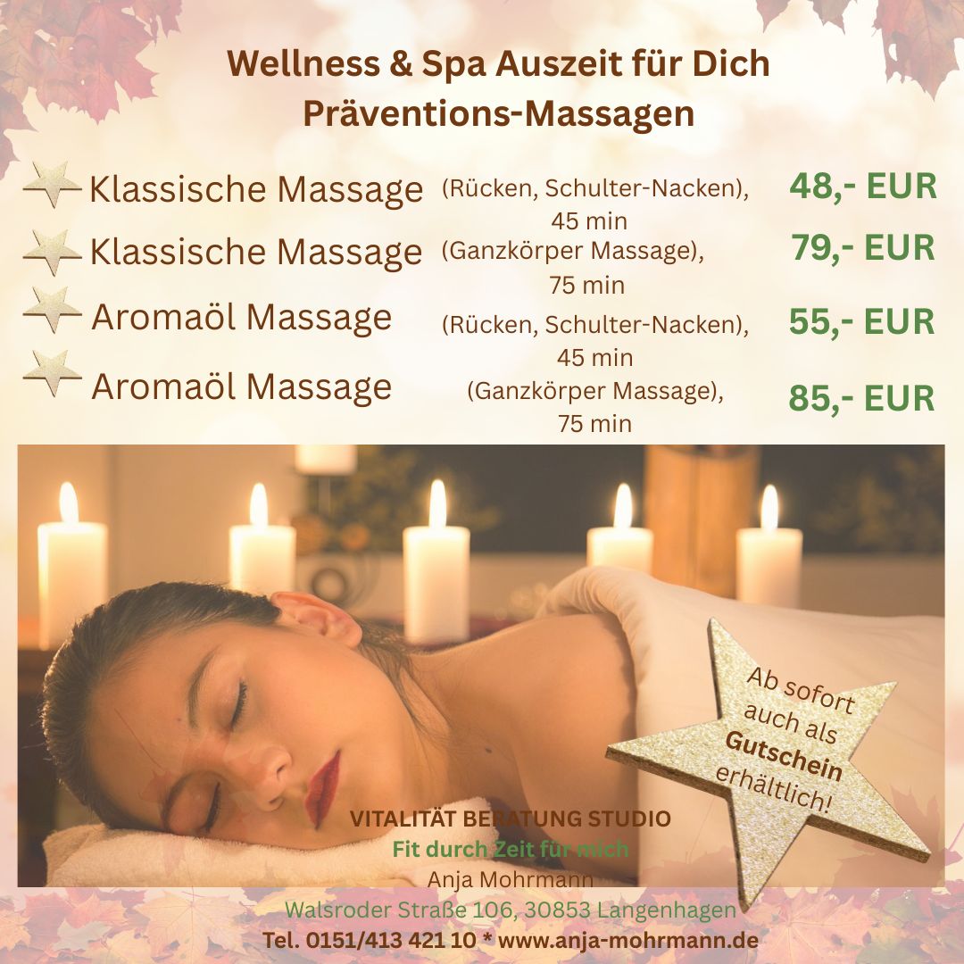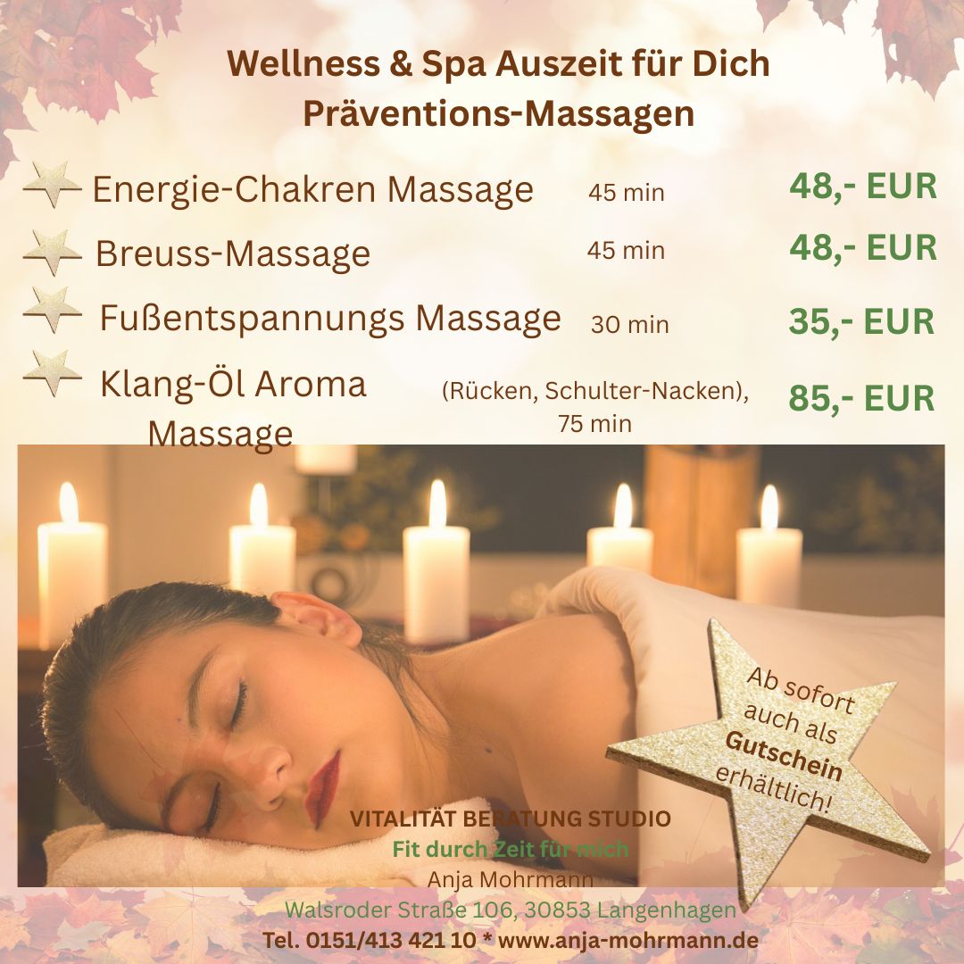 Präventionsmassagen – Tiefenentspannung für Körper und Seele Die Präventionsmassagen im Vital & Beratung Studio bieten wohltuende Entspannung und gezielte Gesundheitsförderung. Durch sanfte Berührungen, rhythmische Streichungen und individuell abgestimmte Griffe werden Verspannungen gelöst, die Durchblutung angeregt und das Lymphsystem aktiviert. Im Gegensatz zur klassischen medizinischen Massage liegt der Fokus hier nicht nur auf körperlichen Symptomen, sondern auf dem ganzheitlichen Wohlbefinden. Ergänzend werden bei Bedarf ätherische Öle, Klang oder energetische Elemente integriert. Die regelmäßige Anwendung dient nicht nur der Entspannung, sondern auch der Prävention von körperlichen Beschwerden, Burnout und emotionalem Ungleichgewicht.